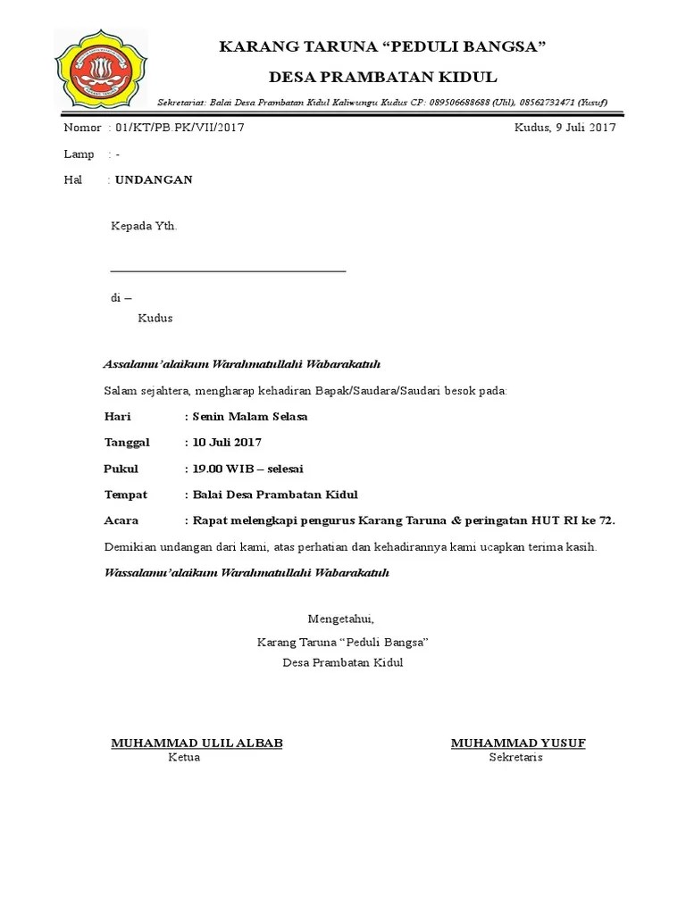 Contoh undangan rapat karang taruna terbaru. Karang taruna warga rw o5. View surat undangan karang taruna.docx from aa 1karang taruna patrabuana desa mekarbuana alamat : Raya dawuhan kulon kecamatan kedungbanteng 53152 cp . Kelurahan melodi indah kecamatan musik kaler.