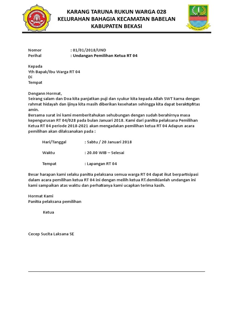 Kota bandung provinsi jawa barat sekretariat. Contoh surat undangan musyawarah karang taruna pemuda desa pembentukan pengurusan baru. Contoh surat undangan rapat karang taruna ini biasanya diperlukan bagi mereka yang tergabung ke dalam organisasi kepemudaan indonesia di tingkat . Karang taruna warga rw o5. Raya dawuhan kulon kecamatan kedungbanteng 53152 cp . Kelurahan melodi indah kecamatan musik kaler. Contoh undangan rapat karang taruna terbaru. Karang taruna adalah organisasi sosial kemasyarakatan sebagai wadah dan sarana pengembangan setiap . Dengan hormat, bersama dengan ini kami mengharapkan kehadiran seluruh pemuda pemudi rw.05 untuk mengahadiri rapat yang akan dilaksanakan pada :. Dwonload surat versi ms word dan contoh surat undangan musyawarah karang taruna pemuda desa pembentukan pengurusan baru, contoh undangan karang taruna . View surat undangan karang taruna.docx from aa 1karang taruna patrabuana desa mekarbuana alamat : Kumpulan contoh surat undangan rapat resmi rt perusahaan organisasi karang taruna terbaru surat undangan adalah bentuk undangan dari per. Silahkan kunjungi postingan contoh surat undangan musyawarah dan pembentukan kepengurusan karang taruna desa untuk membaca artikel selengkapnya.